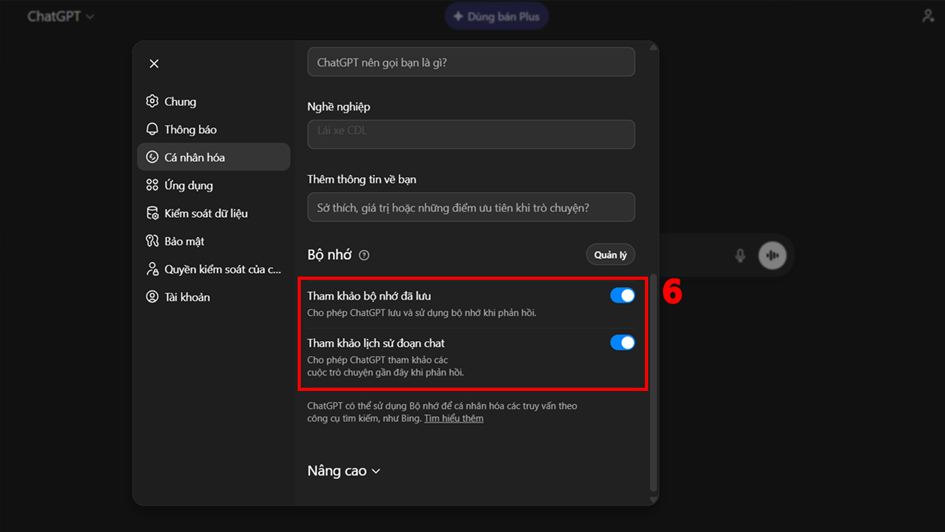 • Bật Tham khảo bộ nhớ đã lưu để ChatGPT ghi nhớ thông tin lâu dài. Bật/tắt Tham khảo lịch sử đoạn chat tùy nhu cầu cá nhân hóa sâu hơn.