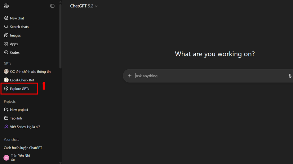 • Tại giao diện chính của ChatGPT, chọn Explore GPTs.
